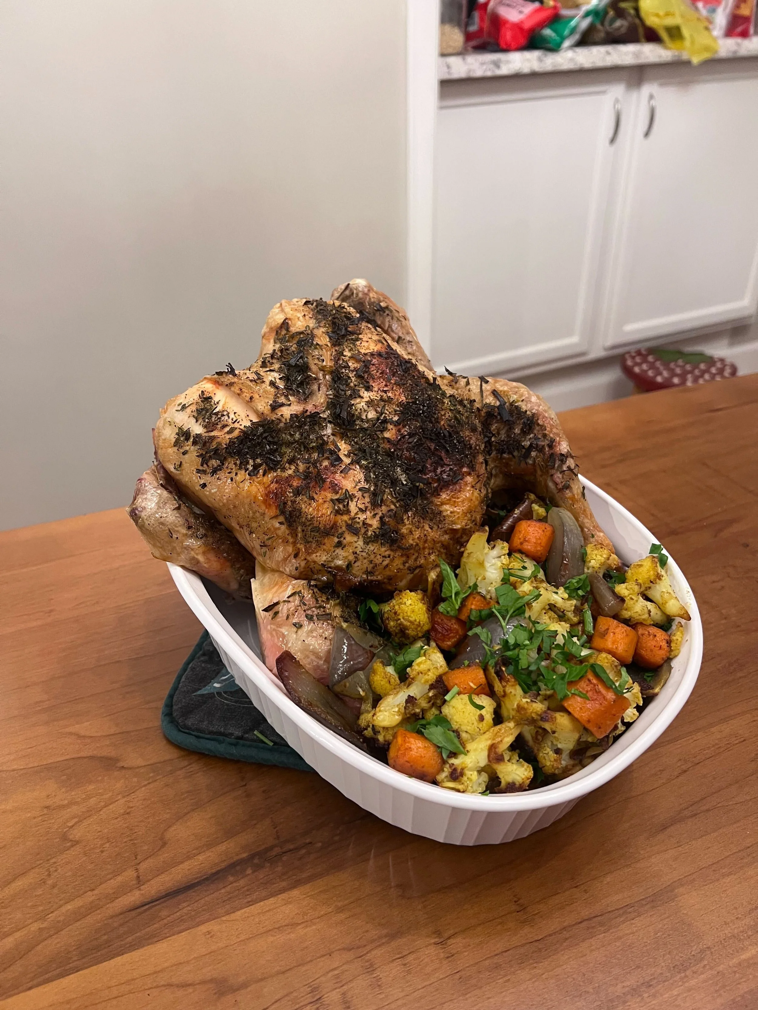This week’s recipe felt a lot like running for office: I usually roast a chicken on its own, but I took a risk and threw the veggies in at the same time. It worked. Turns out, people are always wowed — but it’s not the recipe, it’s the Milford Colony chicken. (Also available at the Real Food Store.)